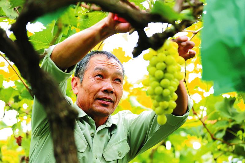 随县厉山镇灯塔社区玉明农场改变之前的零散销售的方式,通过微信、抖音等网上平台,以“线上销售+线下配送”的方式及时把新鲜葡萄送到消费者手中,今年该农场1.5万公斤优质阳光玫瑰葡萄线上销售80%以上,实现纯收入近50万元。(随州日报全媒记者李文军、通讯员蔡琳、老木摄)