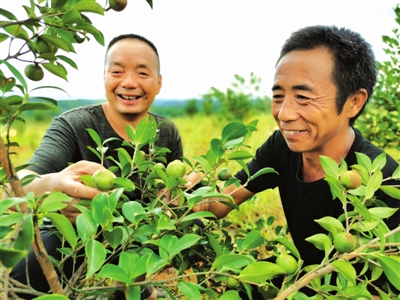 9月10日,崇阳县石城镇汉兴村村民杨四雄(右)在油茶基地查看油茶长势。