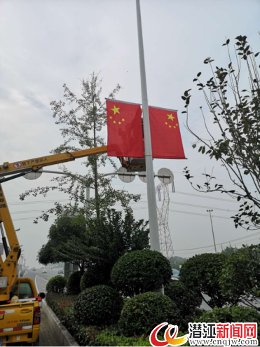 为热烈庆祝中华人民共和国成立71周年,9月27日开始,市路灯管理局组织人员在我市潜阳路、东风路、建设街、章华中路、章华北路、江汉路等重点区域路段路灯灯杆上悬挂五星红旗。