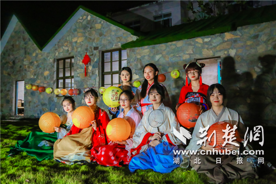 礼毕后,身着靓丽汉服的大学生们提着灯笼在该校江南水乡等地游园赏月。通讯员供图