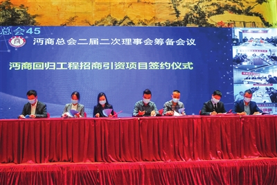 10月11日,沔商总会二届二次理事会以视频会议形式召开。全国各地30多个沔商分会设立分会场,800多名沔商代表参加会议。图为在仙桃主会场举行的招商引资项目签约仪式现场。 摄影 记者 邓娟