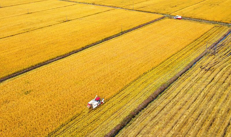 长假过后天气转晴,农民抓住时机抢收水稻。图为10月9日,随县均川镇均河口村农民正在收割水稻。 (随州日报全媒记者徐斌摄)