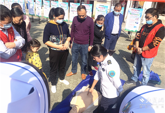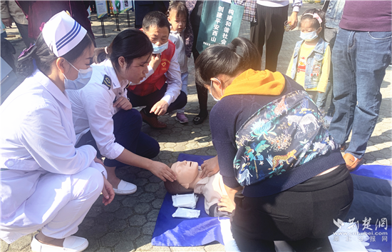 鄂州市中医医院护理志愿者、急诊科骨干护士周春燕和杨文婷现场为居民们进行急救知识培训、心肺复苏术演练,并进行讲解和指导:如何调整体位、打开气道、判断呼吸、胸外心脏按压和人工呼吸等现场施救,居民们都踊跃参与学习并进行了心肺复苏的操作。