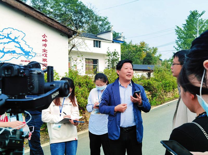 融媒体采访团记者在曾都区洛阳镇小岭冲村采访该村党支部书记甘宏伟。 (随州日报全媒记者徐斌摄)