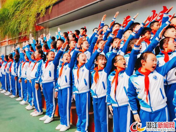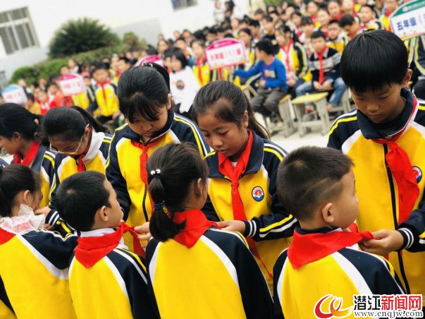 积玉口镇小学举办“红领巾心向党,争做新时代好队员”新队员集体入队仪式,全体少先队员在队旗下唱队歌、行队礼,老队员为30名新队员佩戴上鲜艳的红领巾。