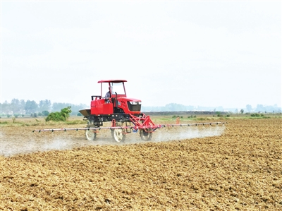当前正是秋收秋播期,在杨林尾镇联合垸,大片的油菜种植已经实现全程机械化。图为10月13日,大型农机正在晓阳村田间翻耕、施肥、撒药。