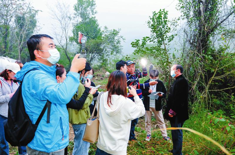 随州日报讯 融媒体采访团记者在随县淮河镇抱朴谷采访景区负责人。(随州日报全媒记者徐斌摄)