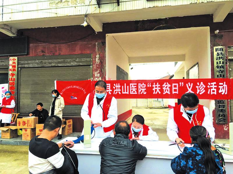 10月17日是全国第七个“扶贫日”,随县洪山医院医疗技术骨干深入洪山镇寺山居委会驻点村开展义诊活动。当天,接待咨询群众400多人次,发放各类宣传资料500余份,免费赠送药品价值2000多元。 (随州日报通讯员 徐军 赵杨 陈传兵 摄)