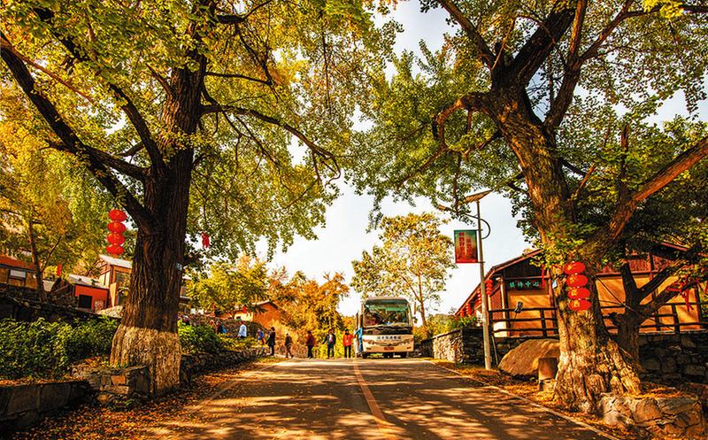 10月22日,一批来自武汉的游客在参观曾都区九口堰红色爱国主义教育基地途中,在胡家河村下车参观当地特色民宿,欣赏银杏美景。