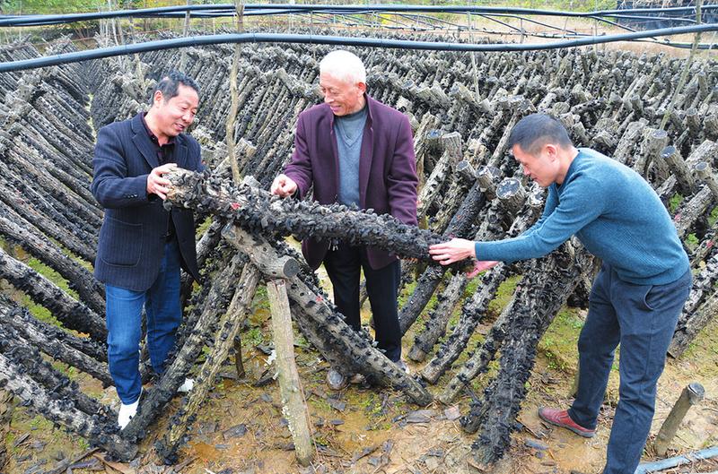 随县澴潭镇油坊垱村菇农张立群的2万棒黑木耳喜获丰收。图为10月28日,张立群介绍他种植的“三不”黑木耳,即:不打药、不用添加剂、不上蜡。产品深受消费者青睐,目前已订购一空。(随州日报通讯员石守京摄)
