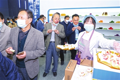 10月28日至29日,湖北省推进美丽城镇建设现场会在仙桃市召开。图为28日,与会代表在三伏潭镇仙桃硒馆品尝富硒特产。