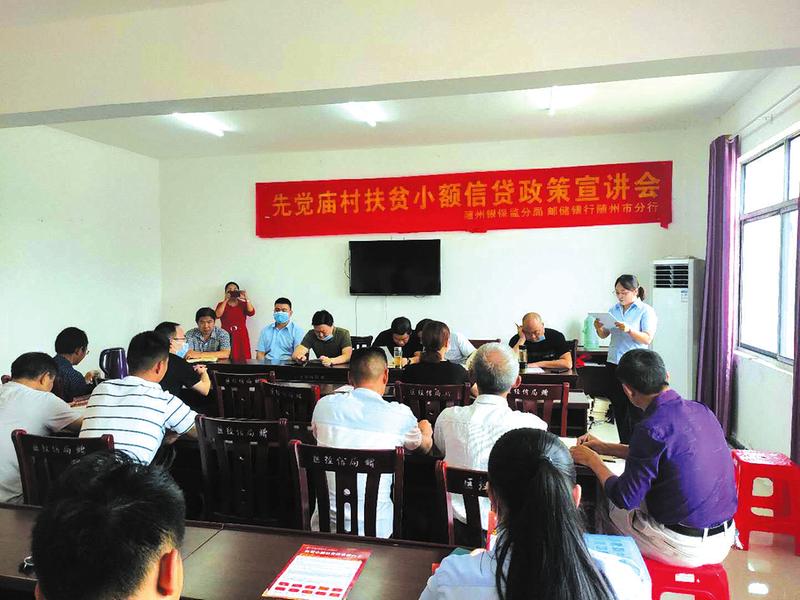 近日,随州邮储银行联合随州银保监局工作人员,到曾都区万店镇先觉庙村开展小额扶贫政策宣讲,与贫困户面对面解释贷款办理事项。 (随州日报通讯员罗姗摄)