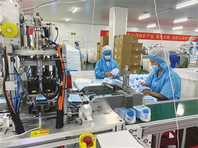 10月31日,裕民无纺布制品公司车间,工人紧张忙碌,机器高速运转。入料、缝合、点耳,一只只蓝色成品口罩从生产线上依次滑出,工作人员进行检验包装,整个生产过程紧张而有序。图为工人们检验口罩现场。