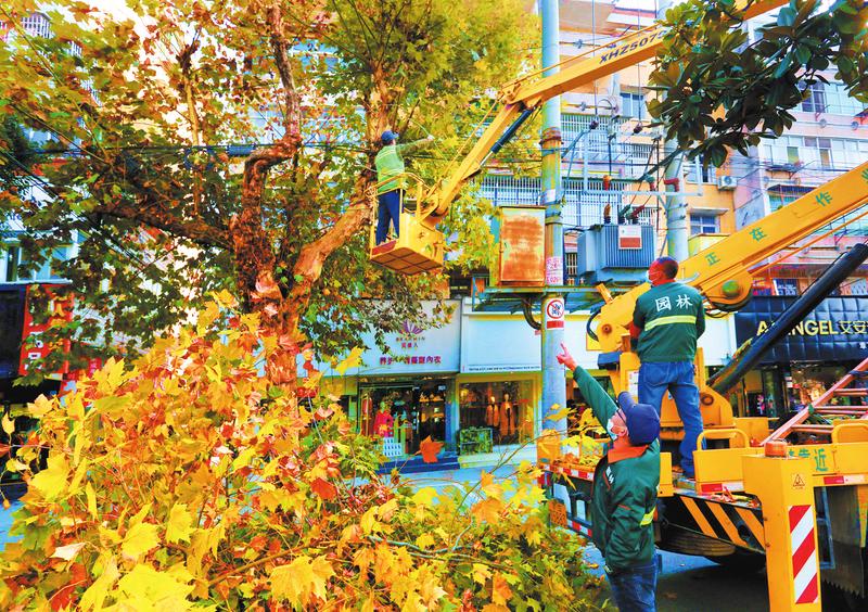 近日,市绿化管理处组织对随城主干道乔木进行集中修剪塑形,消除安全隐患,同时减少法桐来年春天飘絮扰民。(随州日报全媒记者徐斌摄)