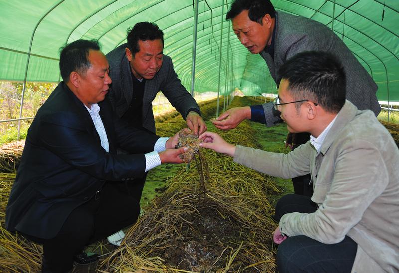 市食用菌协会日前组织专家组到随县淮河镇艺博酒红菇高产出口创汇种植示范基地,指导养菌期温度、湿度、通风、透光、增氧等科学管理。图为基地负责人介绍情况。