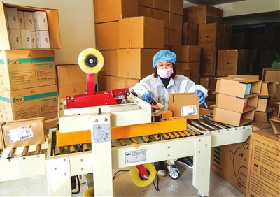 11月10日,鼎成无纺布制品有限公司电商部工人正在打包装箱。2014年该公司着手转型升级,线上线下两条腿走路,自创“小懒”“天编”等品牌,搭建淘宝、天猫、京东等电商平台,多渠道销售口罩、一次性防护服、鞋套等防护用品,建成一个网上网下销售、全国配送的自营体系。目前,日销售额达15万元。