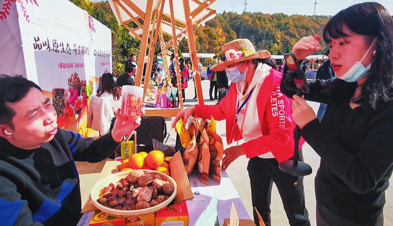 11月13日,曾都区洛阳镇在九口堰革命纪念馆广场举办了以“搭起电商桥,共圆小康梦”为主题的第一届农产品电商节活动,助推农产品销售。图为随州知名网红主播现场直播带货。 (随州日报全媒记者李文军摄)
