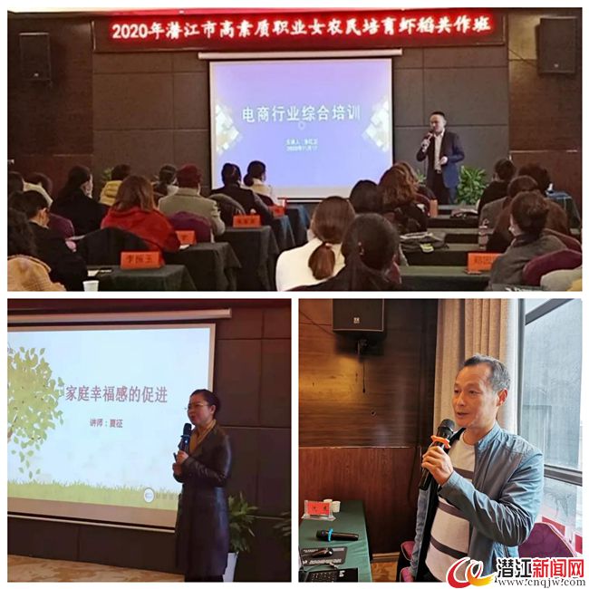 培训班上,市农业发展中心科教科科长沈杰以“新时代高素质农民队伍建设的实践与思考”为题,介绍了高素质农民概念、湖北省高素质农民培育工作现状以及高素质职业农民培育的重要意义;省家庭教育研究会副会长夏征围绕什么是家庭幸福感、为什么要促进家庭幸福感和如何促进家庭幸福感三个方面做了讲解;潜网集团中国虾谷360执行总经理李红卫详细介绍了直播带货,微信视频号、社区团购平台以及虾谷360平台等平台基础知识,分享了文案创作、运营技巧等干货。