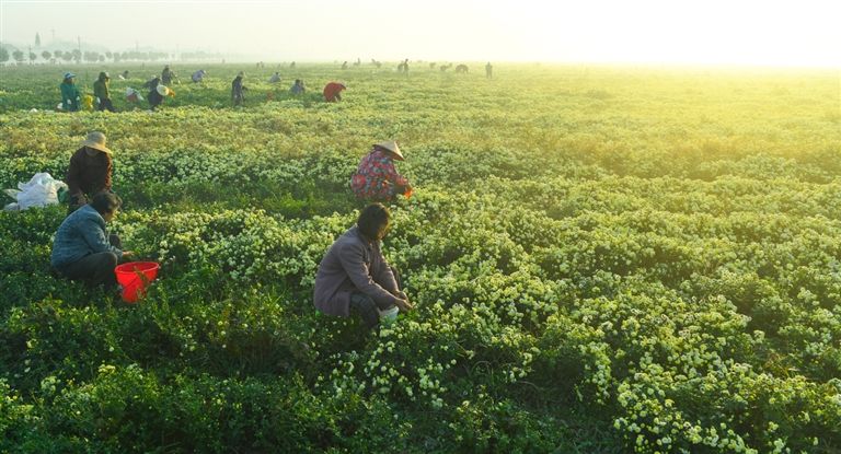 11月15日,晨光熹微,薄雾轻绕。竹根滩镇万滩村菊花基地,100余位农民在田里采摘黄金菊,场面蔚为壮观。该镇沙街村贺金平一直从事农资生意,今年4月在万滩村流转土地5.33公顷种植黄金菊。初冬时节,黄金菊迎来收获季,花儿竞相开放,香气扑鼻。据悉,贺金平将菊花采摘后全部销售给本市茶菊企业加工菊花茶,目前已基本采摘完毕。记者 吴燕军 摄