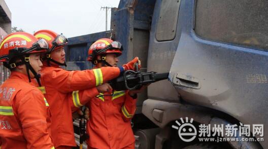 交警部门在现场拉起警戒,疏散两边来往的车辆和人群。消防人员用撑顶器将变形的驾驶舱顶起,再用液压剪扩钳将副驾驶门撬开剪断,使被卡腿部可以自由活动,然后一名消防员进入驾驶室,用力将受伤司机从坐垫上托起,其他消防人员一起用力,将受伤司机抱出,抬上担架,交给早已等候在旁的120医护人员送医院治疗,前后用时约五分钟。