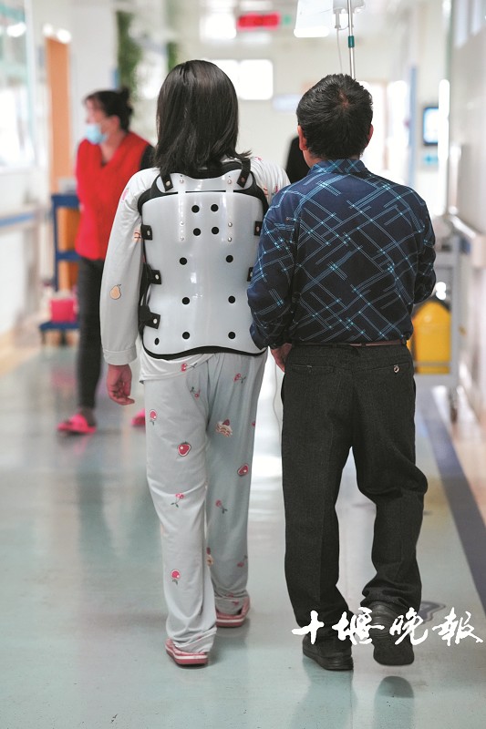 11月20日上午,在太和医院脊柱外科病房,王欣在丈夫的帮助下从病床上起来,准备去走廊活动活动。因处在恢复期,她上身戴着护具。走在病房走廊里,她挺胸直腰,窗外雨后阴沉,但她内心充满阳光,笑容写在脸上——这一刻,她等了30年。