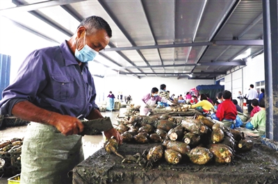 通海口镇康鼎农产品种养合作社采取“合作社+基地+农户”的运营模式搭建农商互联平台,培育出一批叫得响、质量优、特色显的电商产品,形成集种植、加工包装、仓储物流等于一体的完整产业链,带动当地老百姓共同致富。图为11月23日,共和村村民处理当日收购的莲藕。