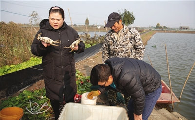 排湖渔场邓丽清夫妇返乡创业,通过电商平台销售排湖鲜活水产,年交易近万单。优质的排湖大闸蟹搭乘互联网快车,“爬”往全国各地。图为11月30日,他们在排北分场收购大闸蟹。