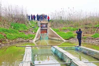11月27日,市五湖保护区打击非法捕捞壕网工作专班,前往阳明大队3000亩湖放壕点、北五湖、南五湖、稻草湖,拆除所有壕沟壕网、放壕标牌广告牌、设立值守卡口等,重拳打击非法捕捞壕网等犯罪行为。图为工作专班正在封堵闸门。