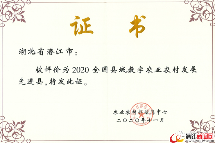 潜江新闻网讯(通讯员 农宣)12月2日,笔者从市农业农村局获悉,2020全国县域数字农业农村发展交流活动11月28日在重庆举行,会上通报了全国县域数字农业农村发展水平评价工作结果,潜江市获评“2020全国县域数字农业农村发展先进县”!