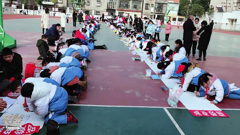 12月15日,曾都区岁丰中心学校举行主题为“妙笔绘童心、岁丰我爱你”绘画比赛活动,200多名参赛选手在百米画布上挥毫泼墨,即兴发挥,展示自己的奇思妙想和对生活的美好憧憬。(随州日报通讯员陈坤林摄)