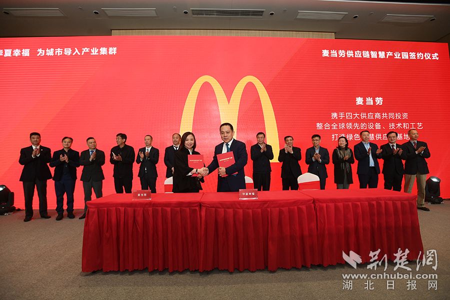 荆楚网客户端-荆楚网消息(通讯员华萱)12月18日,麦当劳中国携四大供应商(泰森、宾堡、新夏晖、紫丹)与孝感市孝南区政府、华夏幸福基业股份有限公司(以下简称华夏幸福)签约,计划投资15亿元,在汉孝产业新城打造其全球首个供应链智慧园区。该项目将通过食品和包装生产、物流、冷链等战略设施聚集湖北,为麦当劳持续开拓中西部市场奠定基础。
