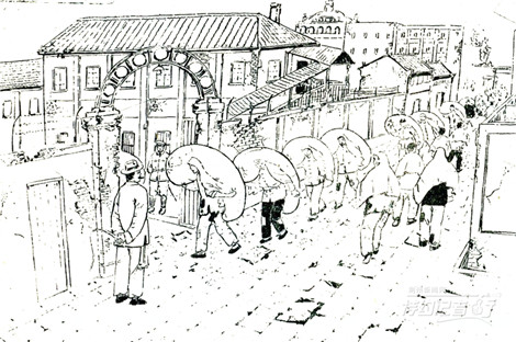 为争口饭吃,半夜鸡叫时就等候在打包厂门口,却遭到巡捕的一阵鞭打。