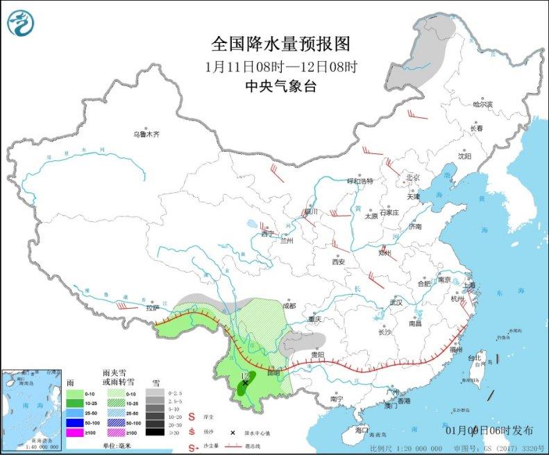 1月10日8时至11日8时,华北北部、吉林东南部、西藏东部、西北地区东部、西南地区东部、云南东北部等地部分地区有小雪或雨夹雪。西藏东南部、四川南部、贵州南部、云南中南部等地部分地区有小雨。内蒙古大部、青海东部、西北地区东部、山西西部、河北北部、河南中部、西藏中部等地部分地区有4~6级风,其中,西藏北部局地有6~7级风(见图2)。