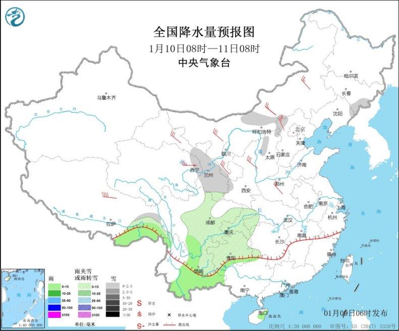 9-10日,西南地区东部有小到中雪或雨夹雪,贵州西部、云南东北部局地有冻雨,关注对交通运输、群众生产生活等不利影响;