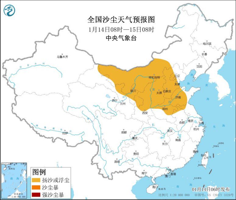 14日至15日白天,受冷空气大风影响,西北地区东部、华北中西部、黄淮中北部等地的部分地区有浮尘天气。15日起,上述地区沙尘天气过程趋于结束。中央气象台1月14日06时继续发布沙尘天气预报。