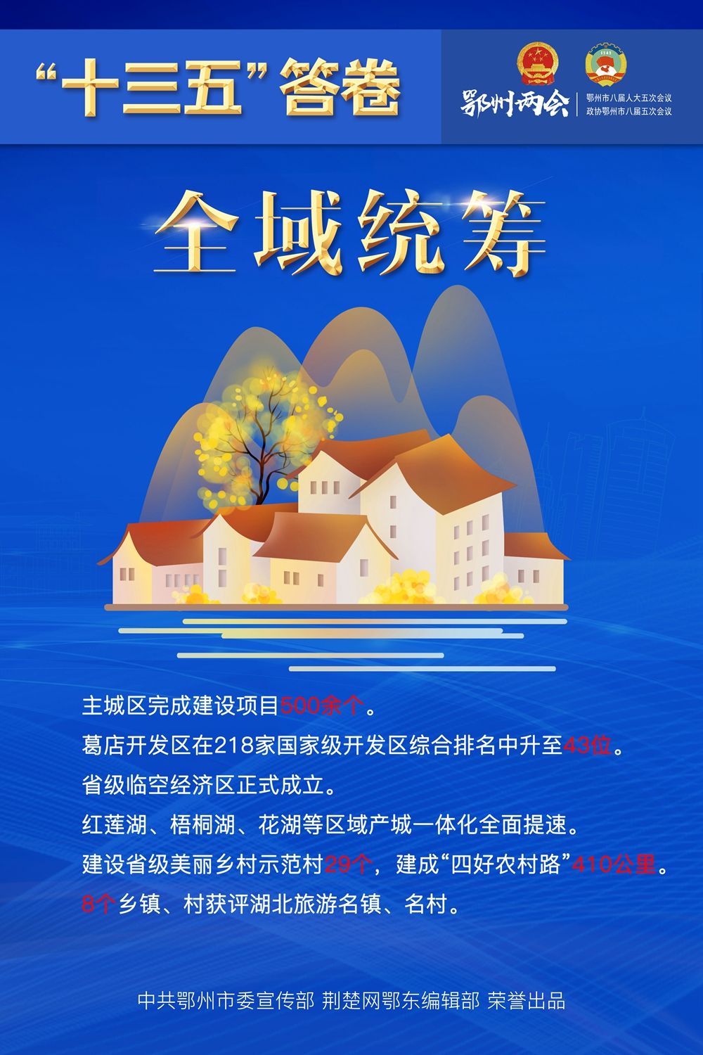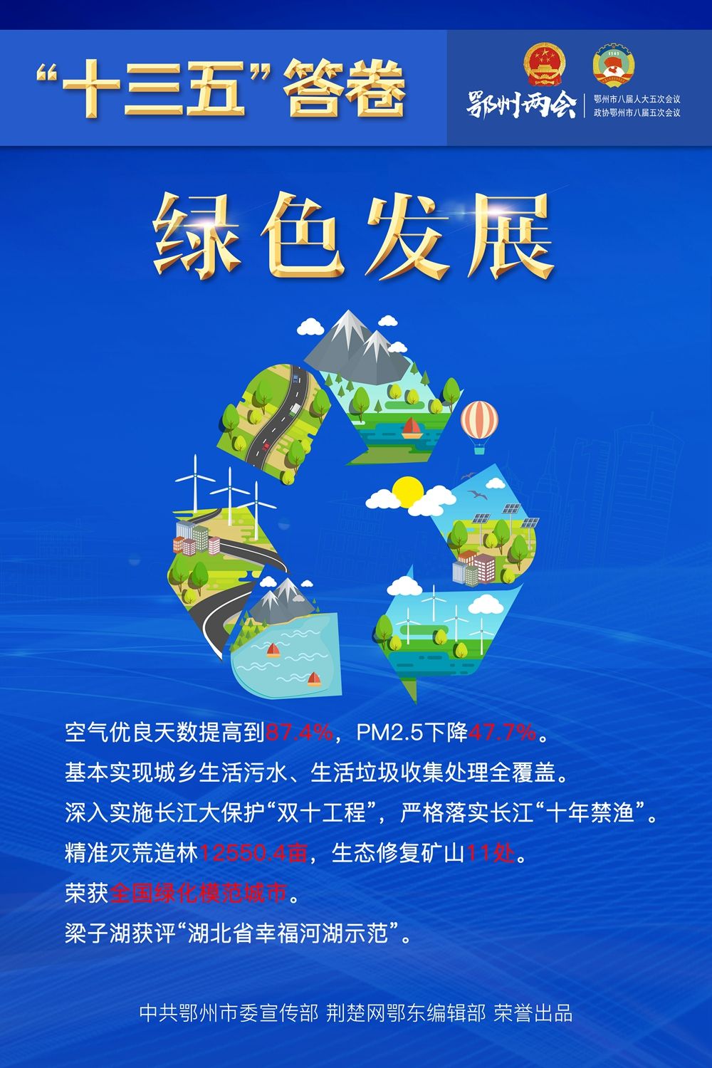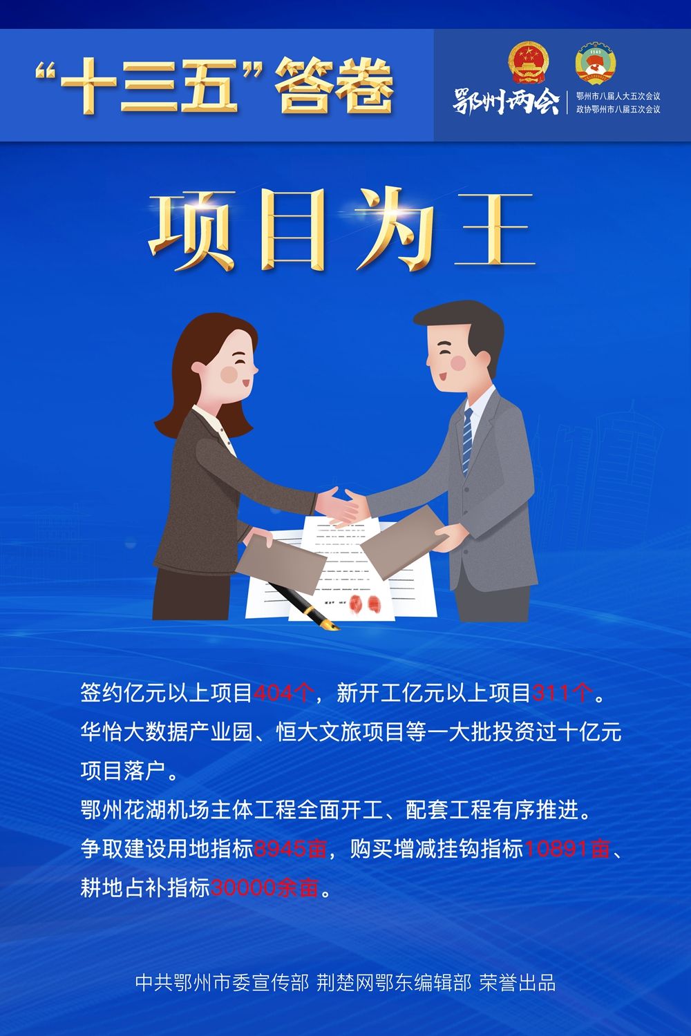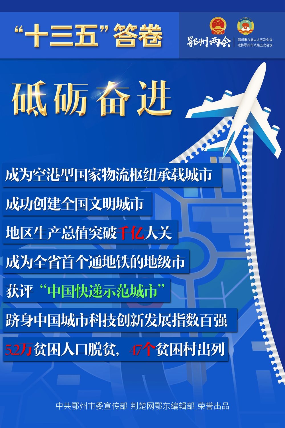 荆楚网客户端—荆楚网消息(记者王焱尧、吕鉴蕾、刘璐 通讯员曾辉)1月15日,鄂州市第八届人民代表大会第五次会议闭幕,为期4天的鄂州两会落下帷幕。回望和盘点,“十三五”表现如何?展望和启程,“十四五”怎样谋划?14张海报,带您速览鄂州奋进“十年 ”。