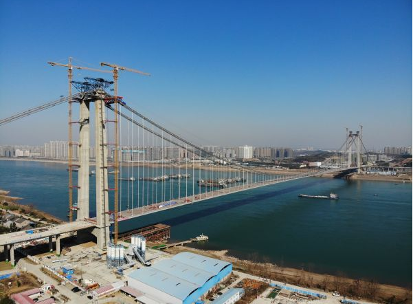 中交二航局主要负责大桥南岸主塔、锚碇、匝道、引桥以及全桥钢箱梁吊装等施工任务。“大桥钢箱梁总重约1.9万吨,由77个梁段组成。”中交二航局该项目负责人介绍,2020年12月8日,大桥启动首榀钢箱梁吊装。此次吊装的合龙梁段重达245.9吨,采用起重能力为500吨的缆载吊机进行吊装,并通过顶推调整端梁的方式确保了合龙精度达到毫米级。
