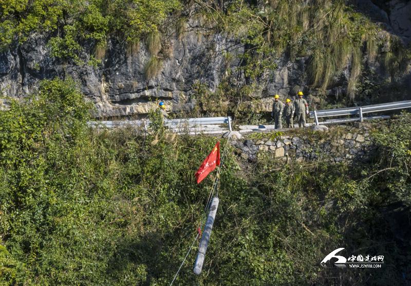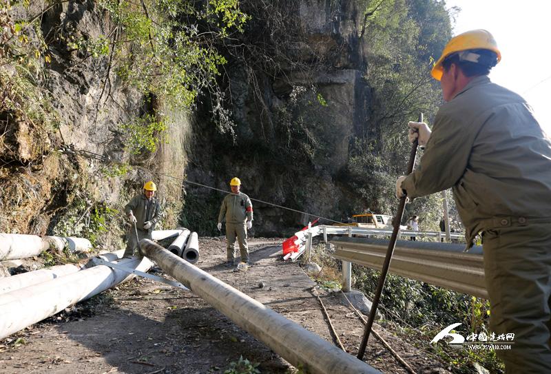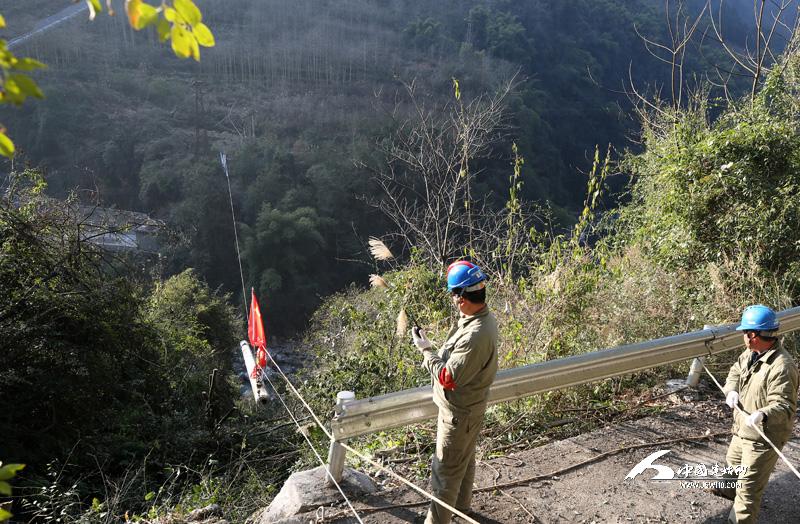 1月18日,施工人员在距景阳集镇30公里远的伍家河峽谷尹家村三组摆开了“战场”。因施工作业点只有一条能容一人通过的小路,重达2000多斤的水泥电杆,无法用人力抬运到施工现场,施工人员只好将电杆运输到峡谷对面高燎村6组的公路上,然后架设近200米的空中索道,将7根水泥电杆传送到对岸作业点。