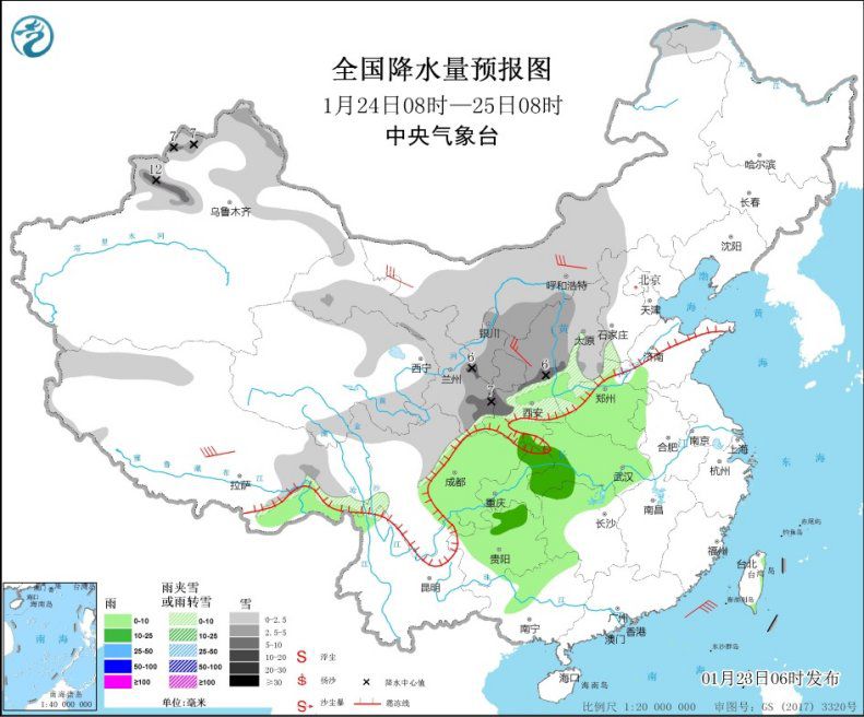 1月24日08时至25日08时,新疆北疆北部和东部、新疆伊犁河谷、西北地区中东部、华北西部、黑龙江西北部、西藏东部、川西高原北部等地部分地区有小到中雪或雨夹雪,其中,新疆北疆北部和伊犁河谷、甘肃东南部、陕北高原南部等地部分地区有大雪,新疆伊犁河谷局地有暴雪(10~12毫米)。西藏东南部、西北地区东南部、黄淮西部、江汉、湖南北部和西部、西南地区东部等地部分地区有小雨,局地有中雨。西北地区中东部、内蒙古中西部等地部分地区有4~6级风。