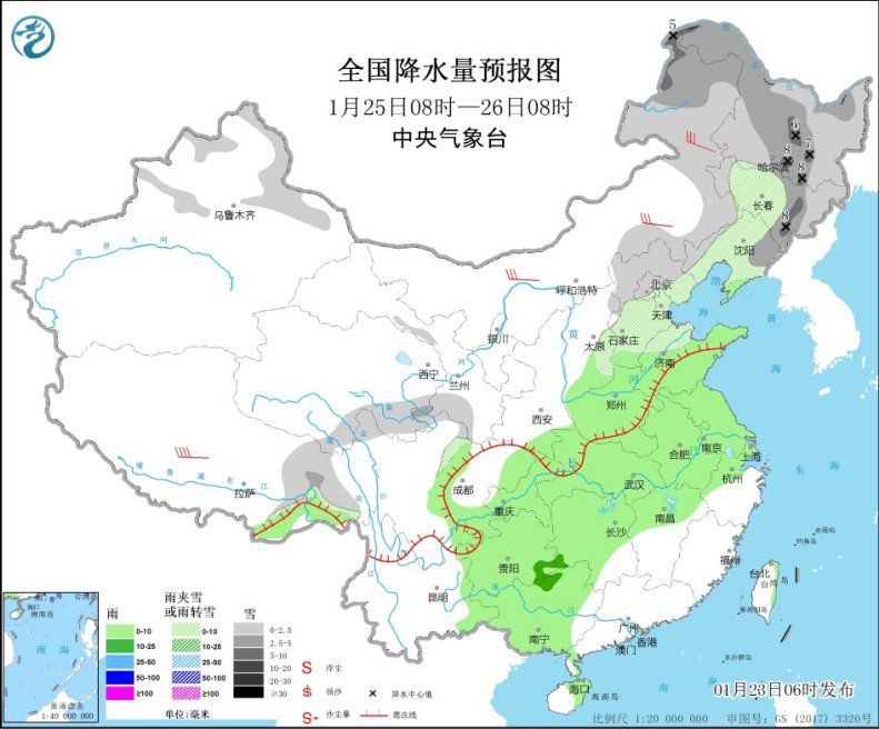 1月25日08时至26日08时,内蒙古东部、东北地区大部、西藏东部、青海南部、华北中北部等地部分地区有小雪或雨夹雪,其中,内蒙古东北部、黑龙江中西部和东南部、吉林东部、辽宁东部等地部分地区有中到大雪(5~8毫米)。华北南部、黄淮大部、江淮、江汉、江南北部和西部、西南地区东部、华南西部等地部分地区有小雨,局地有中雨。内蒙古中东部、东北地区等地部分地区有4~6级风。