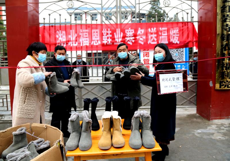 1月27日,湖北福恩鞋业爱心团队来到建始县红岩寺镇福利院,采用“隔窗”方式将30多双雪地靴皮棉鞋送给院民,为院民送上新春祝福。