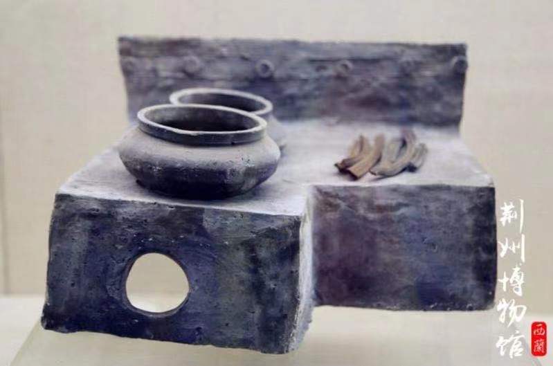陈列在荆州博物馆“五大夫遂——凤凰山168号汉墓”展的这件陶灶,出土于1975年,为五大夫遂的随葬器物。它是按遂大夫生前使用过的陶灶缩小后带进墓葬的,设计科学,可一灶两用,前锅热菜,后锅热水。出土时,灶膛内还有木柴。