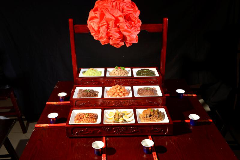 二道茶(俗称湿茶),上九味桌盒,以卤菜、腊味为主,俗称“九个碟子”,辅以四盘两碗,再配以糍粑、面条等主食组成。二道茶可以饮酒助兴。