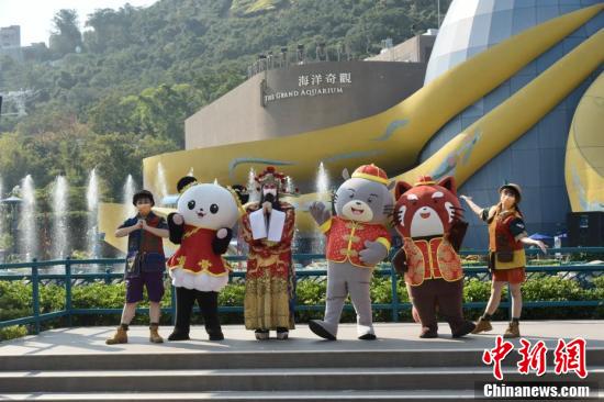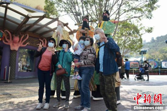 2月18日,香港疫情放缓,海洋公园当日重开,不少市民入园游玩,园内职员提醒游玩市民需注意社交距离,安全游玩。图为市民于海洋公园与福禄寿合影。