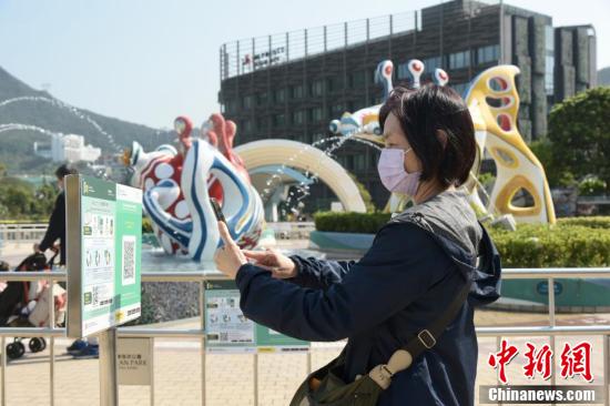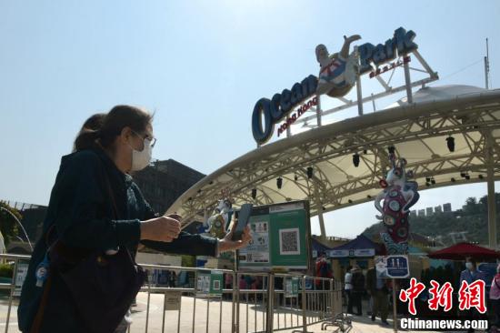 2月18日,香港疫情放缓,海洋公园当日重开,不少市民入园游玩,市民入场须扫“安心出行”二维码入园,园内加强防疫。图为市民进入海洋公园须扫“安心出行”二维码。
