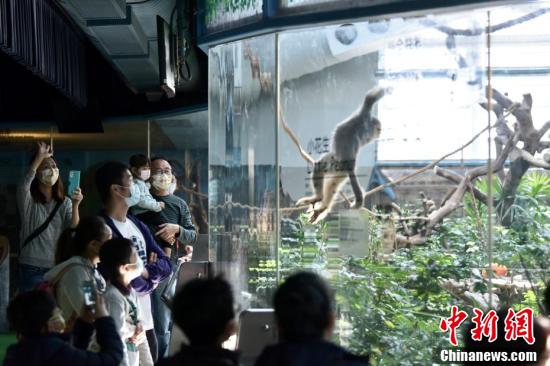 2月18日,香港疫情放缓,海洋公园当日重开,不少市民入园游玩,园内职员提醒游玩市民需注意社交距离,安全游玩。图为市民于海洋公园观看川金丝猴。