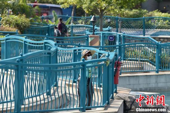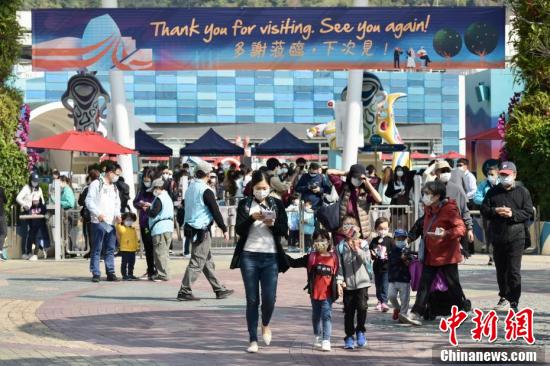 2月18日,香港疫情放缓,海洋公园当日重开,不少市民入园游玩,园内职员提醒游玩市民需注意社交距离,安全游玩。图为市民于海洋公园游玩。