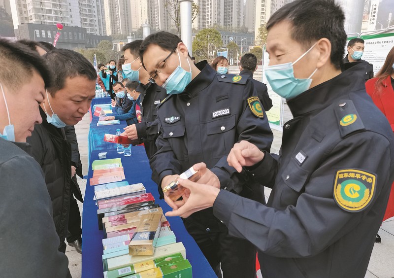 3月13日,市烟草部门工作人员向市民宣传鉴别假冒卷烟知识。当日上午,我市在十堰传媒中心广场举行主题为 “守护安全 畅通消费”的3·15国际消费者权益日纪念宣传活动,市消委、市场监管局、公安局、司法局、卫健委、农业农村局等18家单位及部分诚信商家在活动现场设置咨询台和曝光台,为市民提供宣传讲解和咨询服务。记者刘旻摄