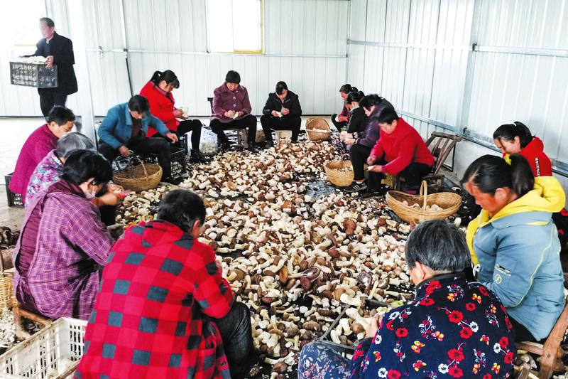 随县高城镇罗家桥村鸿福兴食用菌种植专业合作社利用国家财政扶贫产业发展资金种植的赤松葺菌菇喜获丰收。图为3月15日,该村近30名脱贫户参与菌菇采摘、分拣、去杂、切片、烘干等工作,人均月收入近3000元。(随州日报全媒记者李文军、通讯员韩铁流摄)