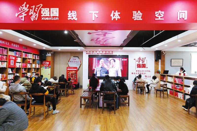 随州市新华书店积极主动做好党史学习教育主题图书订购发行工作,在店内设置专题展区,开辟“学习强国”线下体验空间。图为市民在“学习强国”线下体验空间阅读书籍,观看红色电影。 (随州日报全媒记者徐斌摄)